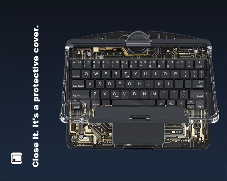 Flagship Model 360° Rotatable Transparent Keyboard Case with Trackpad & Pen Slot (Black Gold Design) - Arabic/English Layout